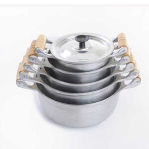 Conjunto de 5 panelas de alumínio fundido grosso, ideal para uma cozinha moderna. Cabos de madeira envernizados, desempenho térmico superior, antiaderente e fácil de limpar. Medidas variam de 14 a 22 cm de diâmetro, com capacidades de 0,70 a 3,2 litros.